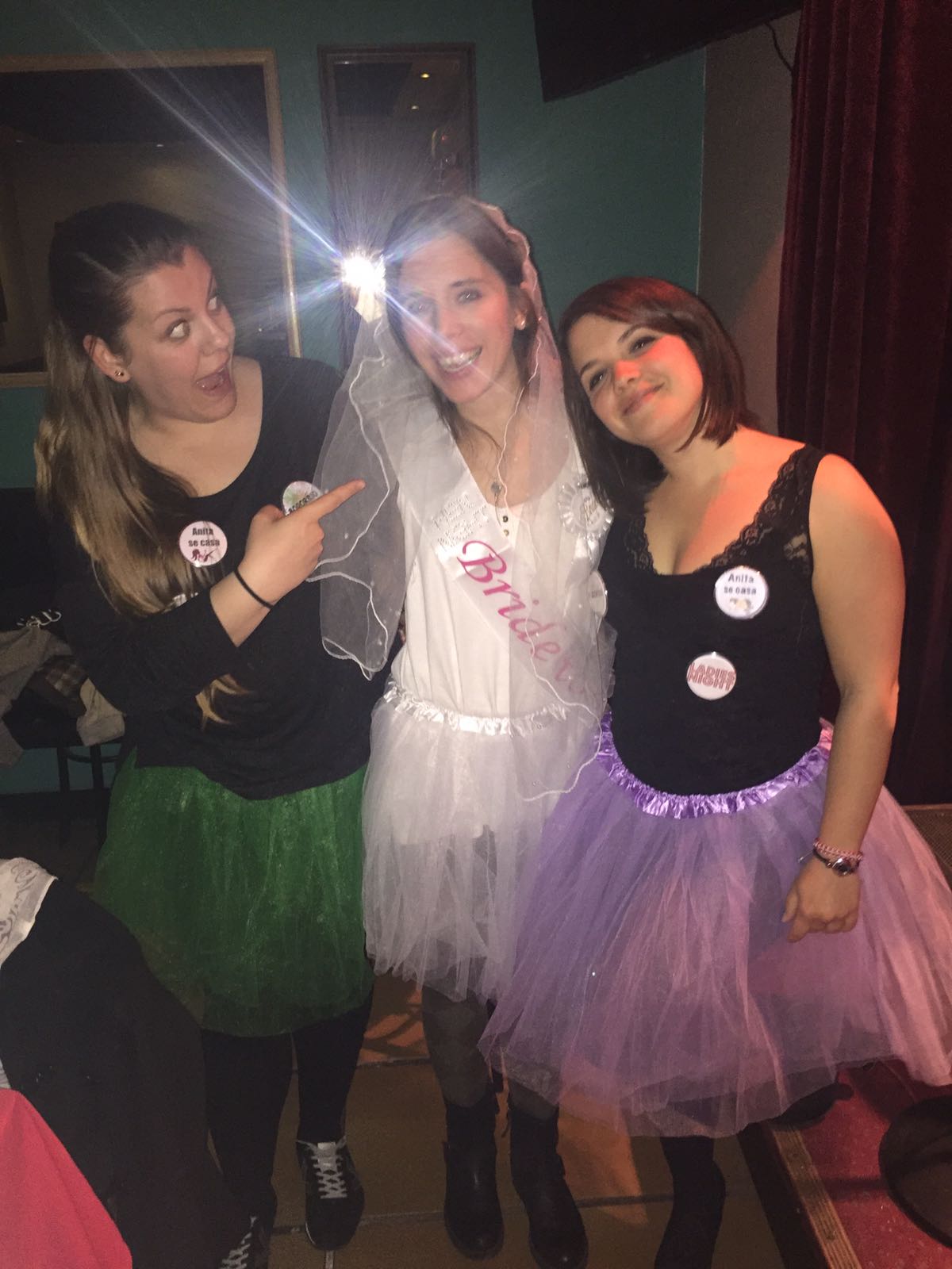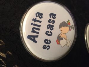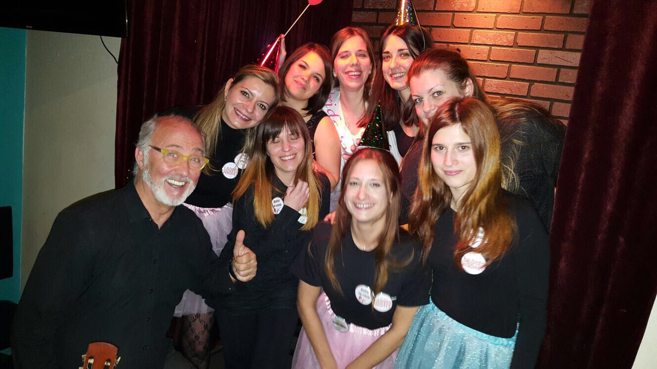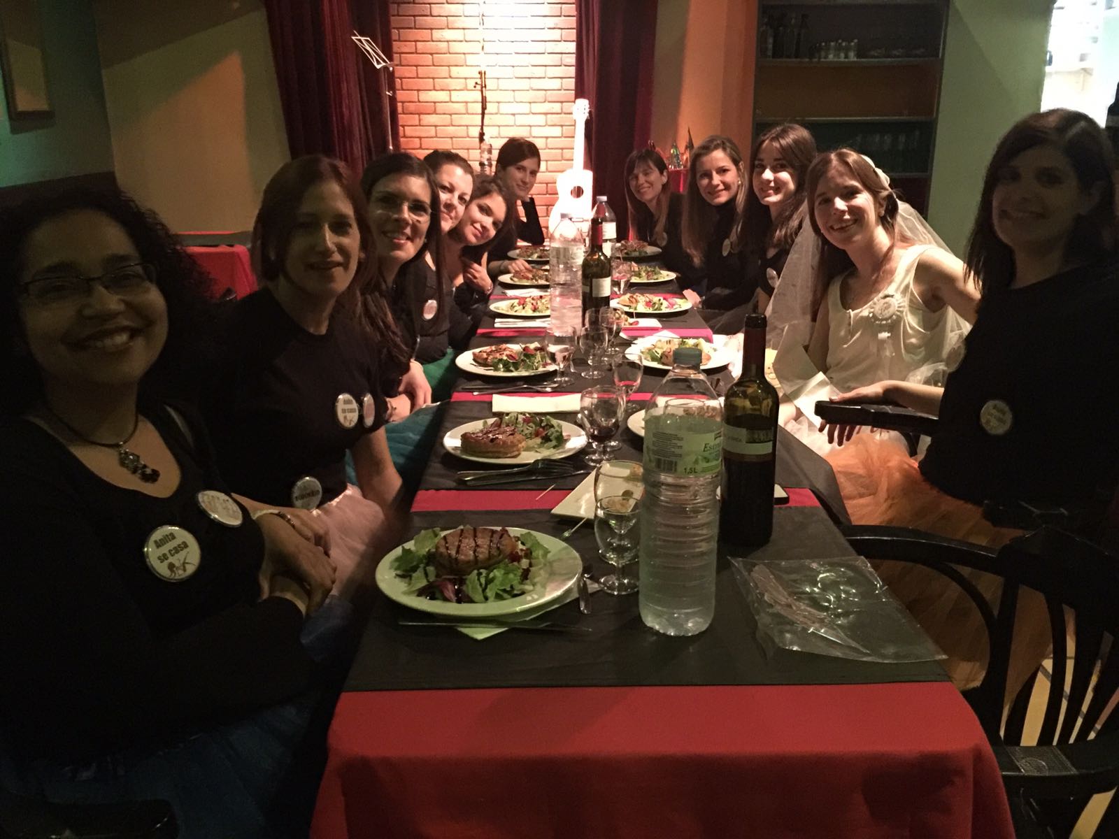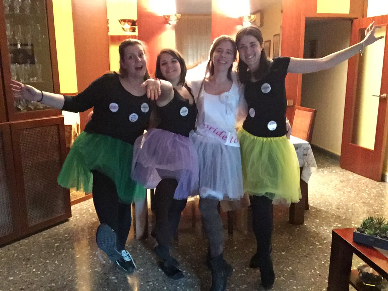 De repente me dijeron: Ana ya hemos llegado, te hemos de vendar los ojos que ya viene el enanito torero y bombero…. y me metiron en un sitio…. y cuando me destaparon los ojos estaban todas en un restaurante vestidas con su tutu y con unas chapas preciosas hechas especialmente para la ocasión!